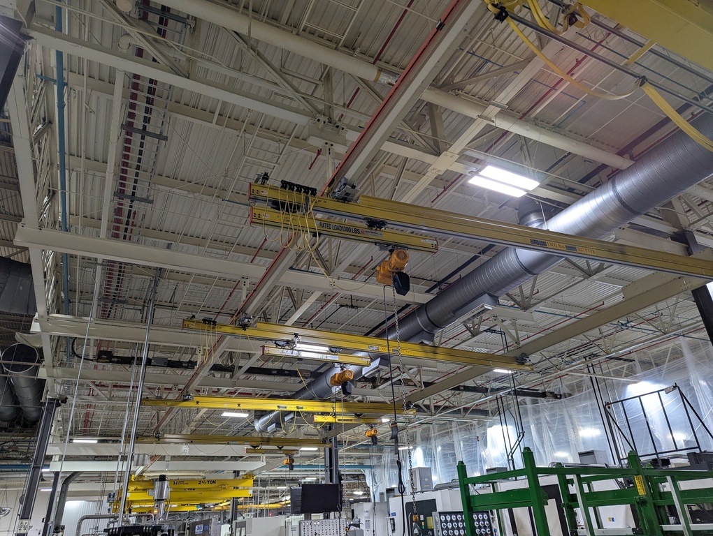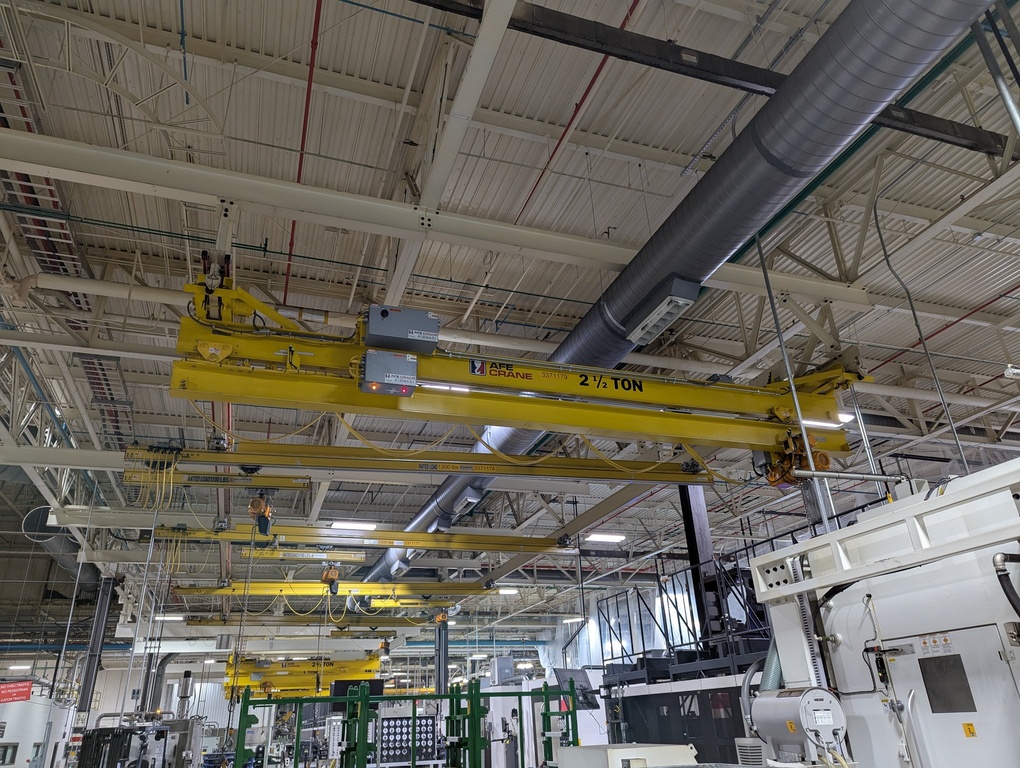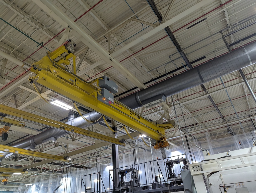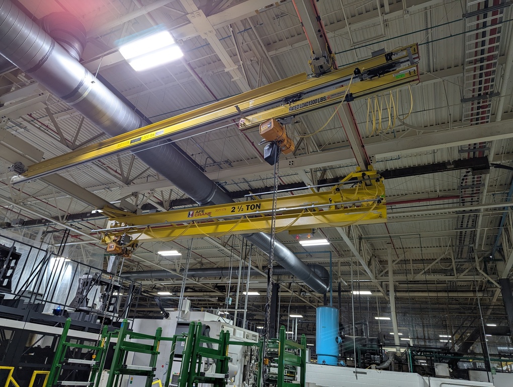Both crane types are underhung, allowing them to run directly on the lower flange of a runway beam. This design eliminates the need for floor space, making telescoping cranes perfect for environments with space constraints or obstacles. Contact us to learn which telescoping crane fits your needs!